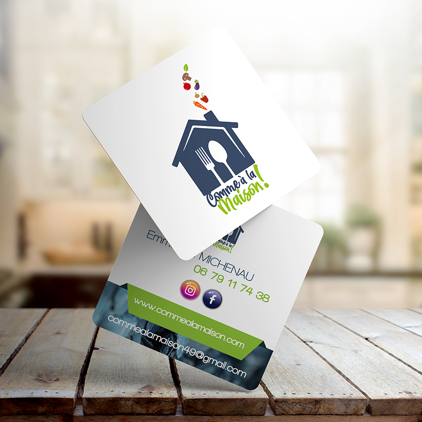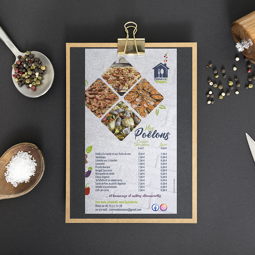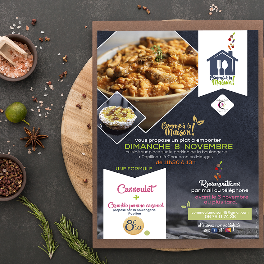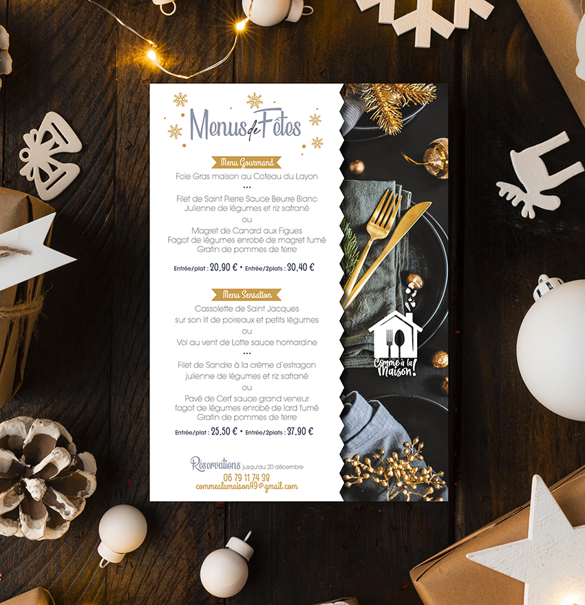 Nous avons utilisé la silhouette rassurante d’une maison pour évoquer le confort et la tradition. Au cœur de cette structure, l’intégration de la cuillère et de la fourchette en espace blanc crée une lecture immédiate de l’activité : ici, le foyer se situe autour de la table.