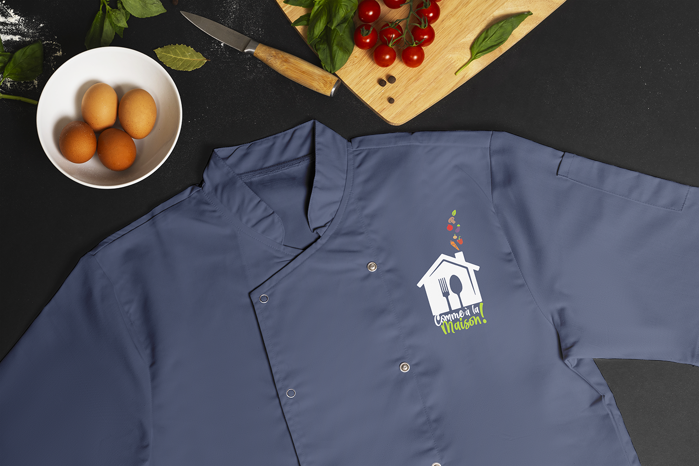 Le bleu nuit apporte le sérieux et l'assise d'un service professionnel, tandis que le vert lime et les couleurs vives des légumes insufflent de l'énergie et de la modernité.