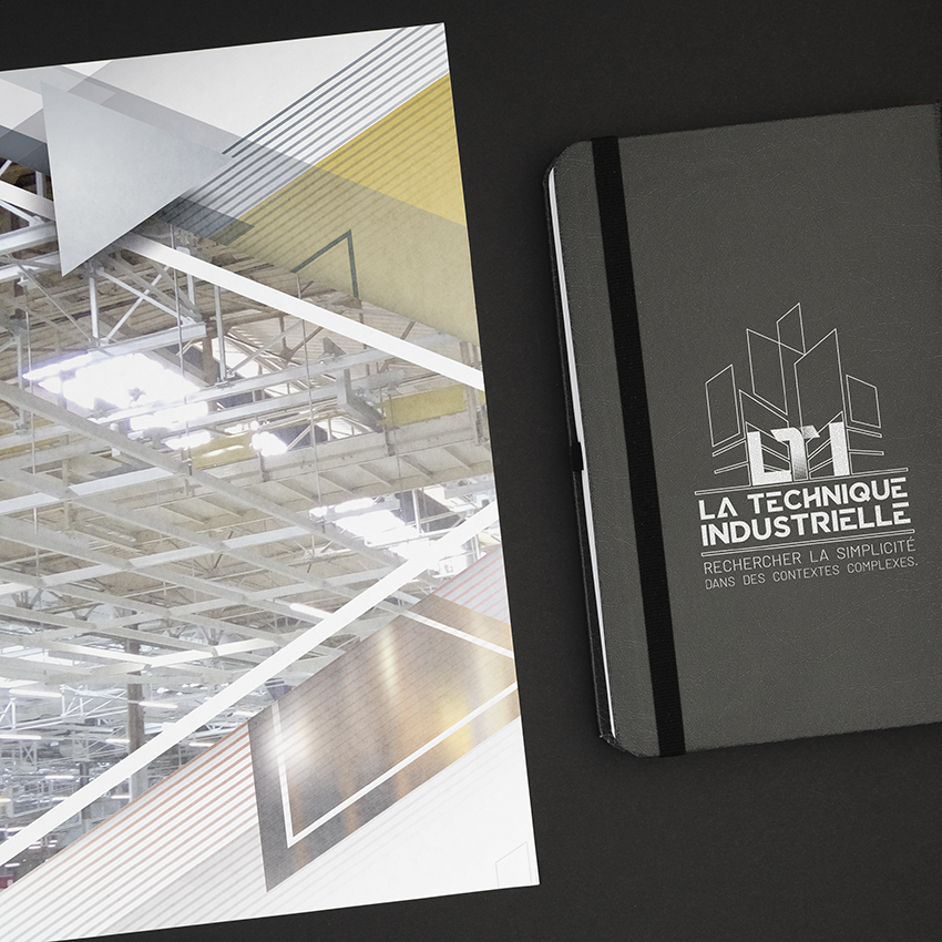Le nom "LA TECHNIQUE INDUSTRIELLE" adopte désormais une police plus légère et déstructurée. Les ouvertures dans les lettres (comme le "E" ou le "Q") rappellent les tracés de découpe et l'innovation. L’œil du Studio Plumeria