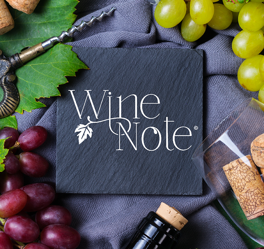 Le lien entre les mots « Wine » et « Note » par une ligne calligraphique renforce cette idée de continuité et d’harmonie.
