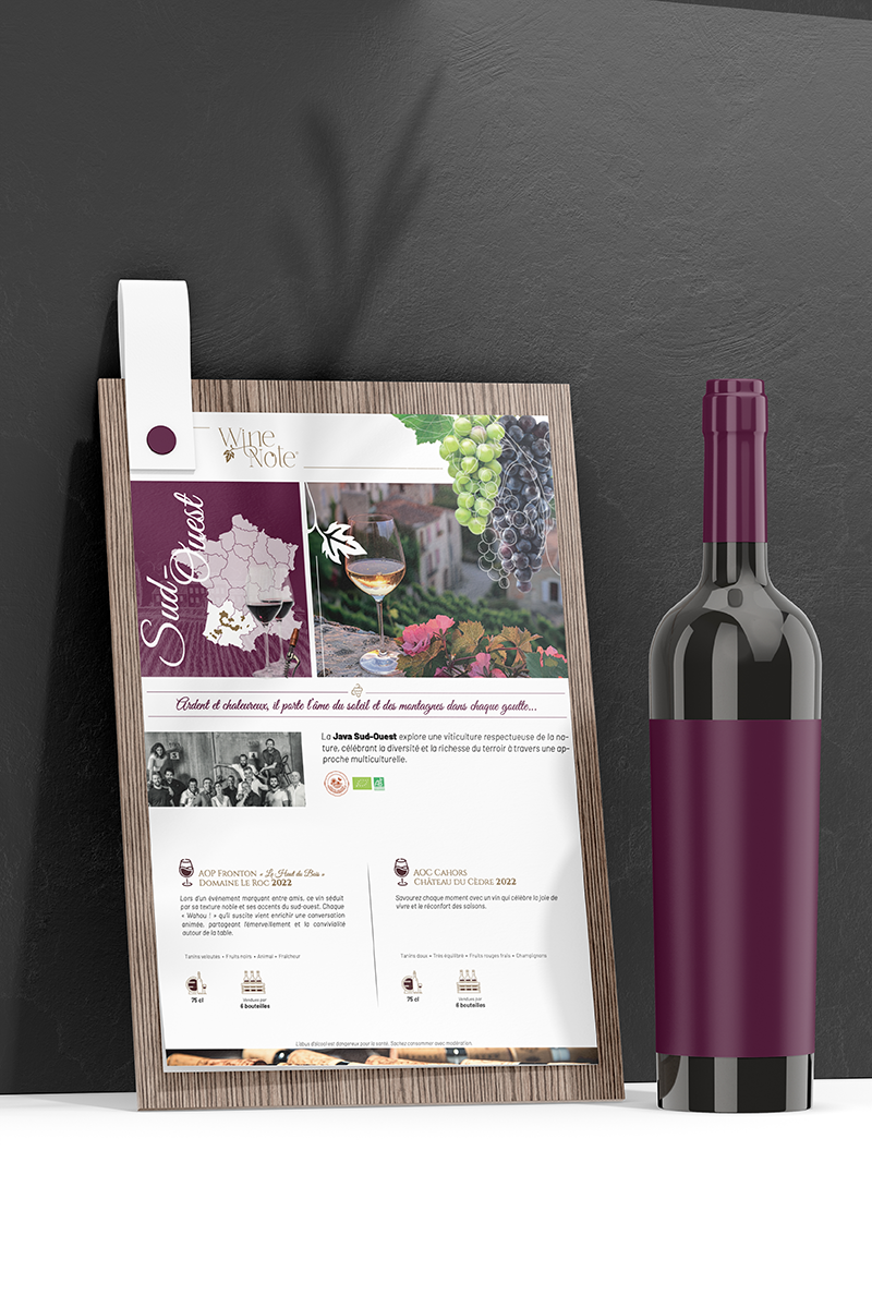 Le nom «Wine Note» est un jeu de mots subtil. En dégustation, la «note» fait référence aux arômes (notes de tête, de coeur). Graphiquement, ce concept est magnifiquement illustré par les arabesques dorées et bordeaux.